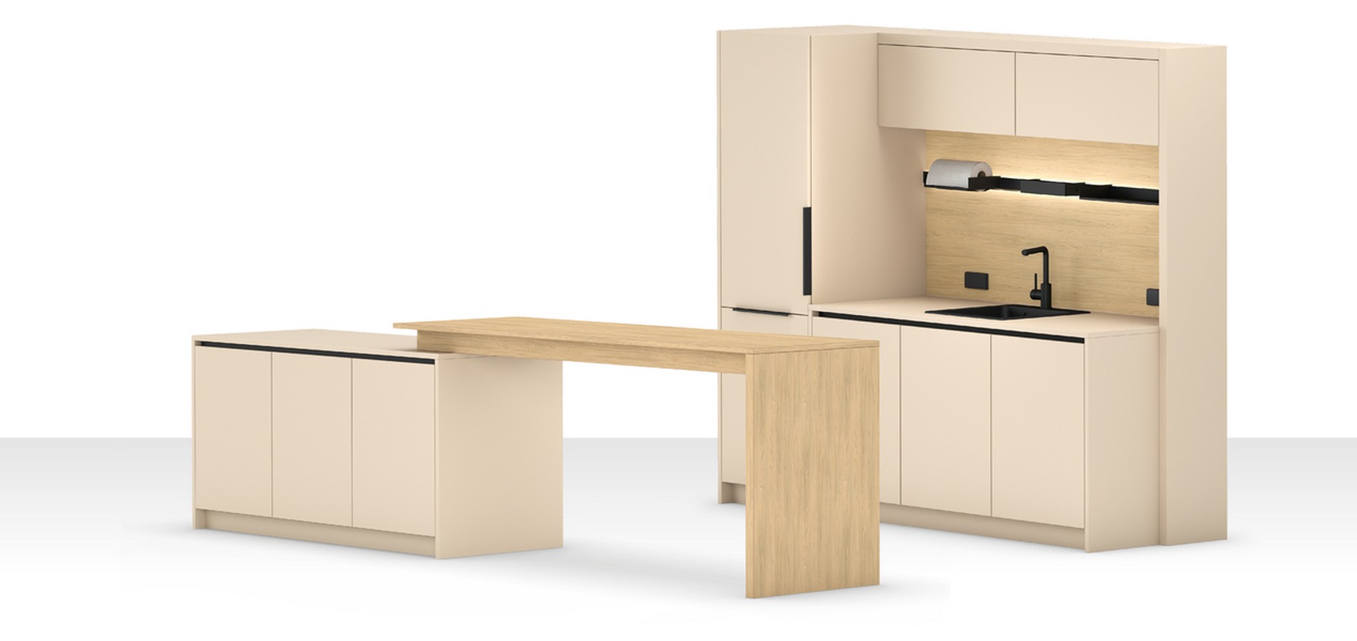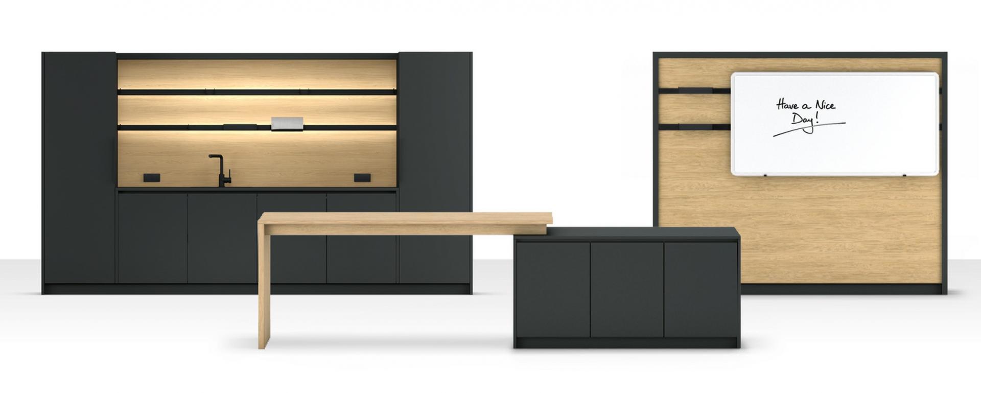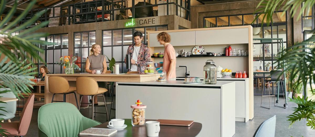 Als Anlaufstelle für spontane Treffen und Austausch im Büro schaffen die Cateringmodule eine informelle und ungezwungene Atmosphäre. Die Kommunikation ergibt sich hier von selbst und dank der vielfältigen Stellvarianten passen sie in jede Räumlichkeit.