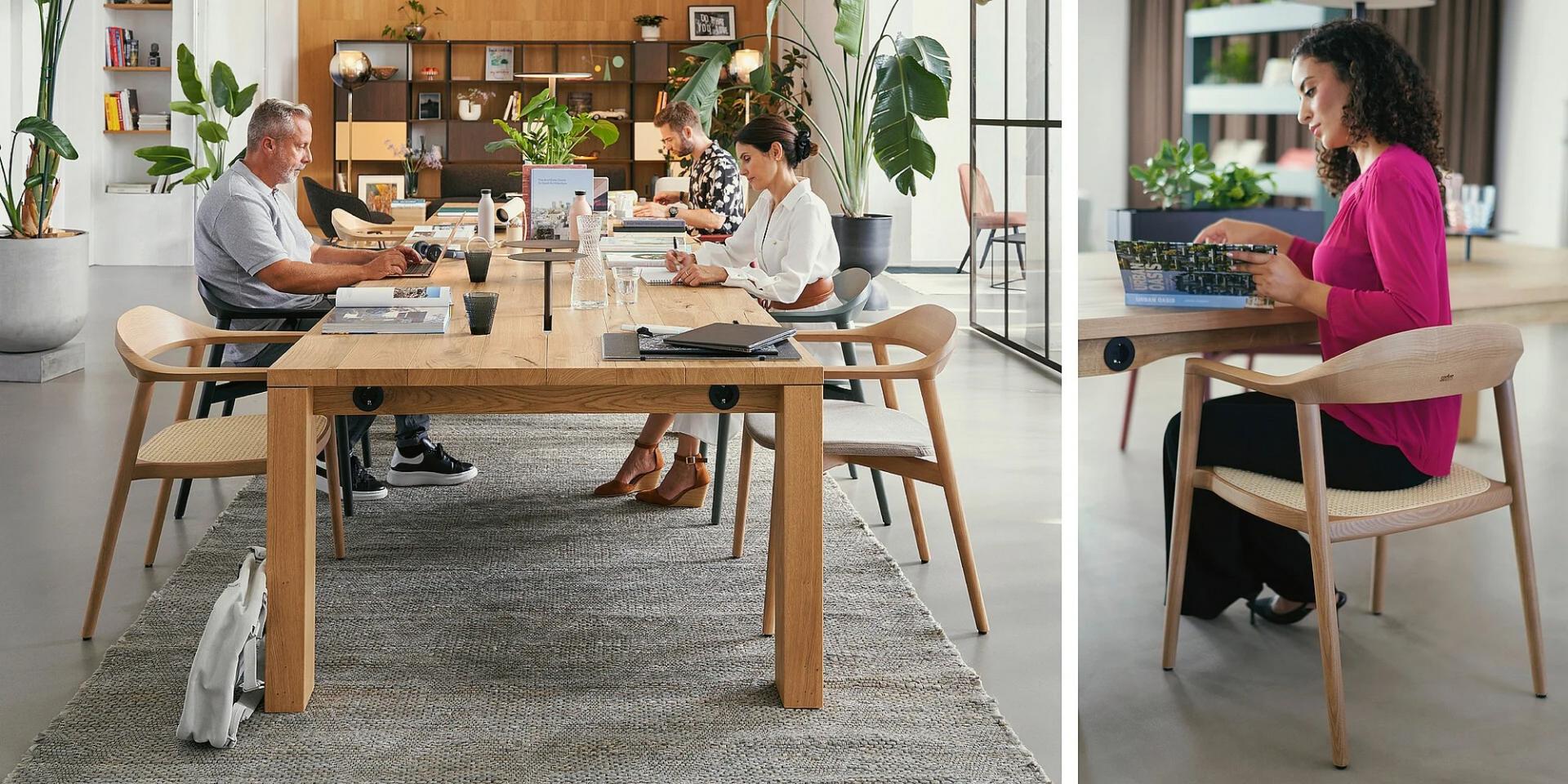 Egal, ob im Work Café, in Ruhezonen oder an Knotenpunkten, der Massivholzstuhl schafft in jeder Umgebung eine natürliche Atmosphäre. Erhältlich in zwei Sitzhöhen sowie in der Variante mit Wiener Geflecht bietet er zudem mehrere Anpassungsmöglichkeiten.