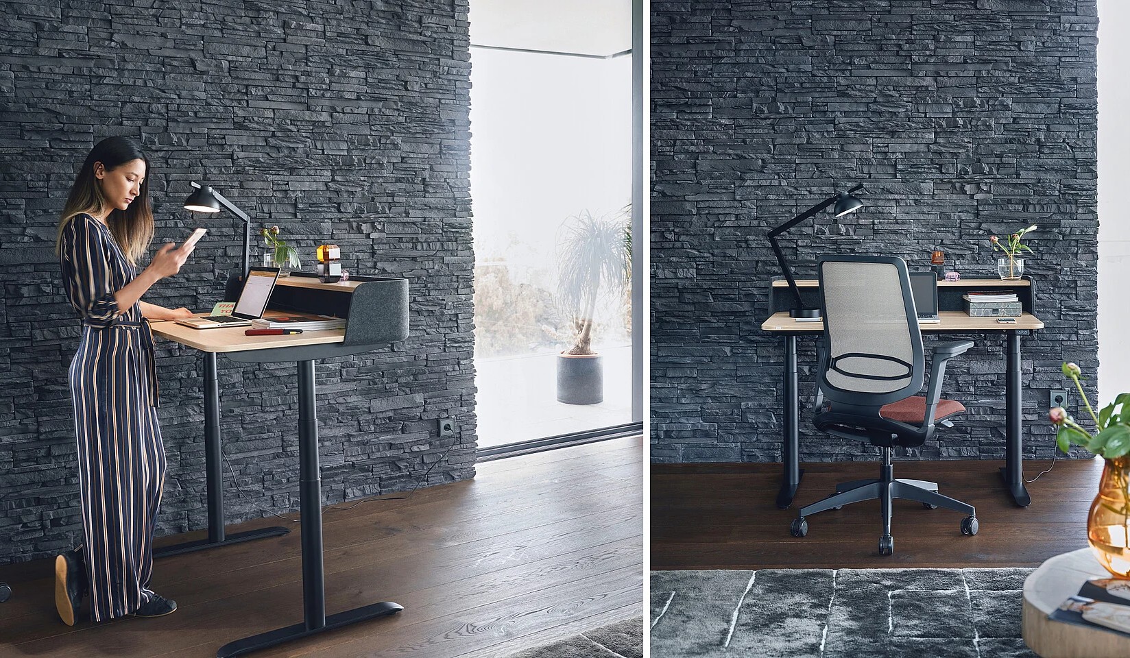 Der elektrisch höhenverstellbare Tisch folgt der Arbeitshöhe des Nutzers und bietet somit besten ergonomischen Komfort – egal, ob sitzend oder stehend.