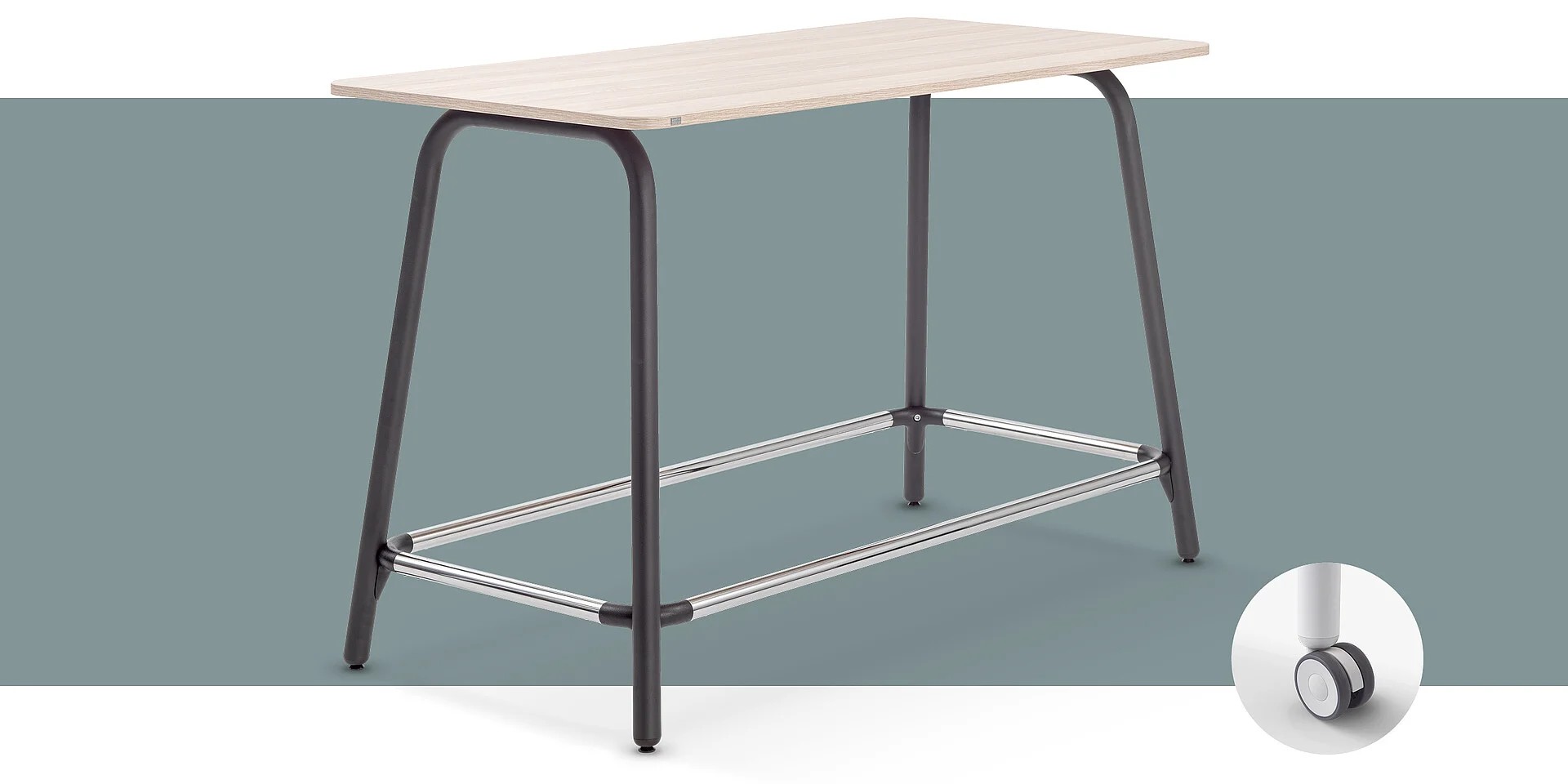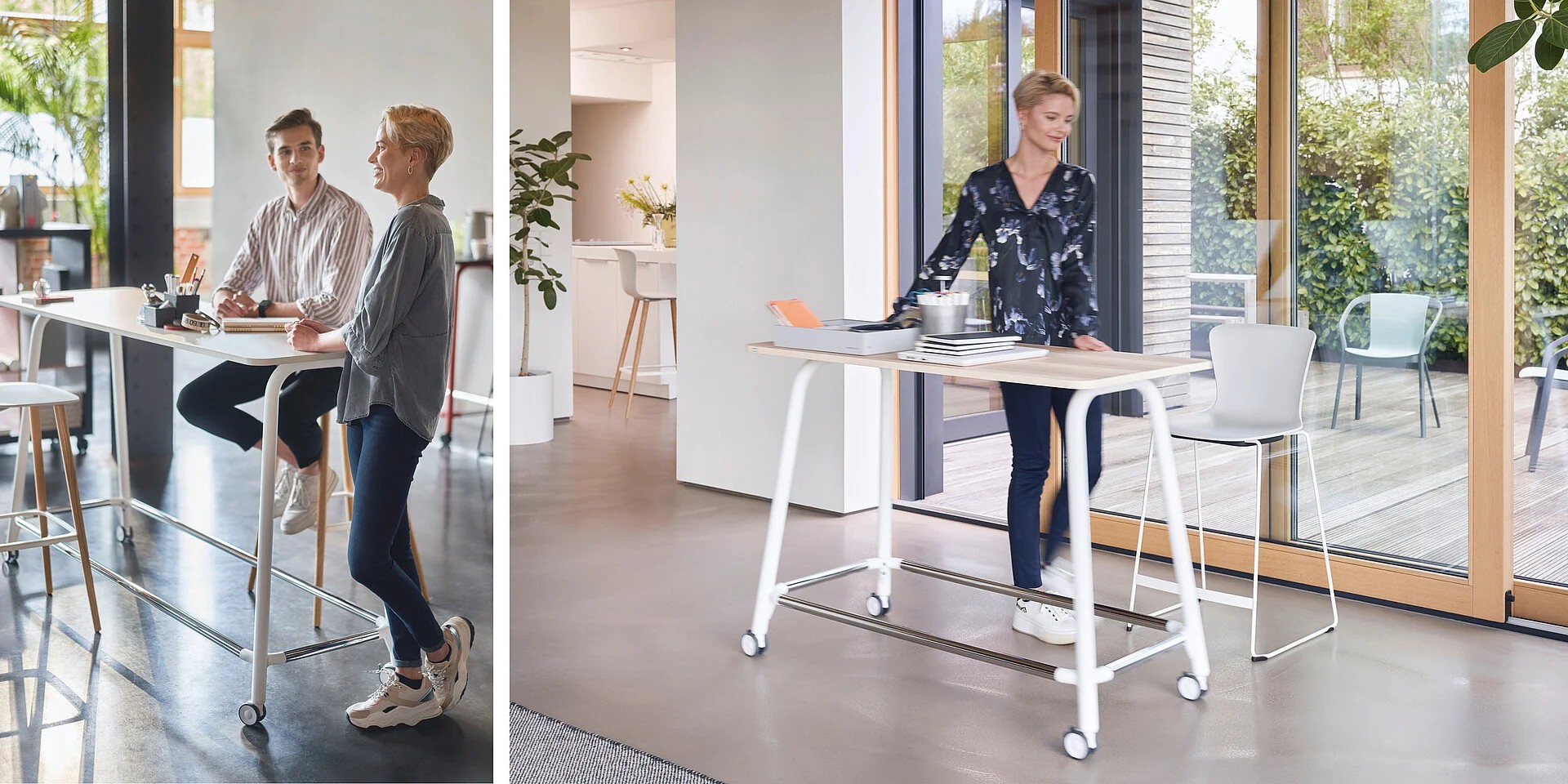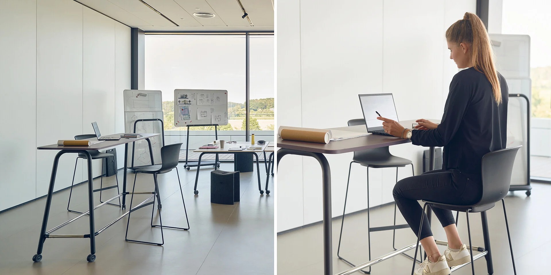 Dank der Ausstattung mit Rollen kann se:lab high desk unkompliziert umgestellt werden und ist damit perfekt geeignet für Anwendungen in Büro-Mittelzonen und Workcáfes.