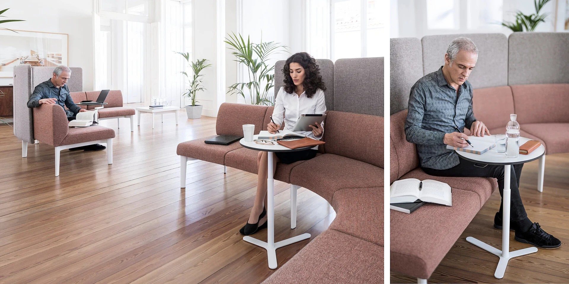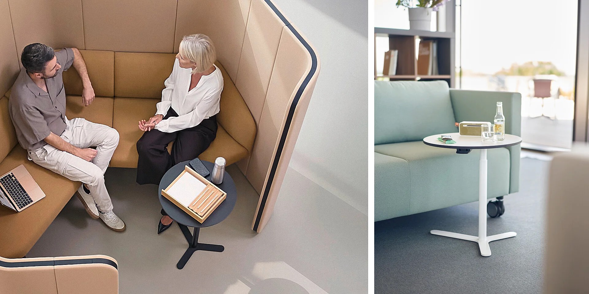 Die Einzeltische von se:works sind in der Höhe so abgestimmt, dass sie eine ergonomische Arbeitshaltung am Sofa fördern.