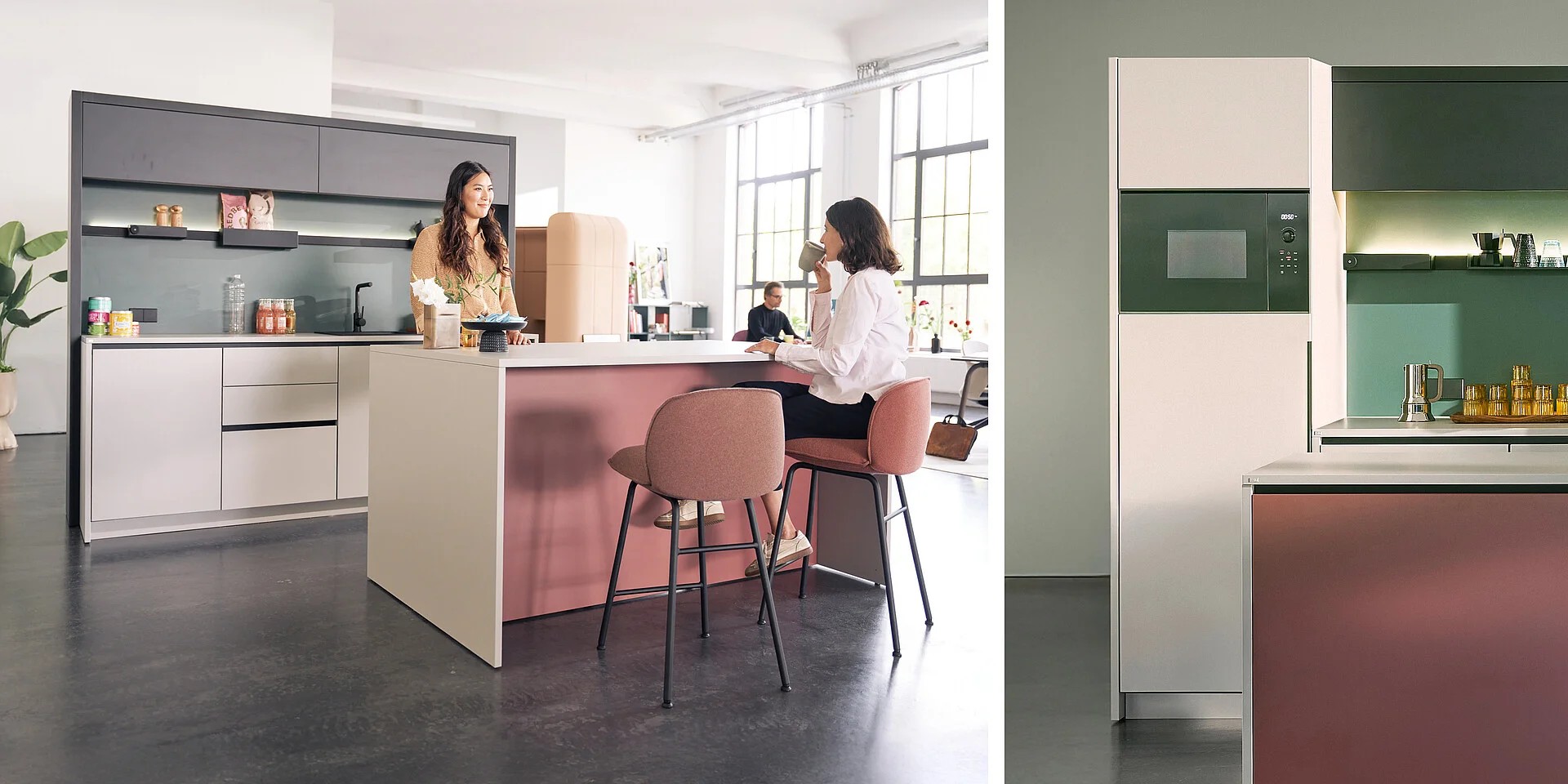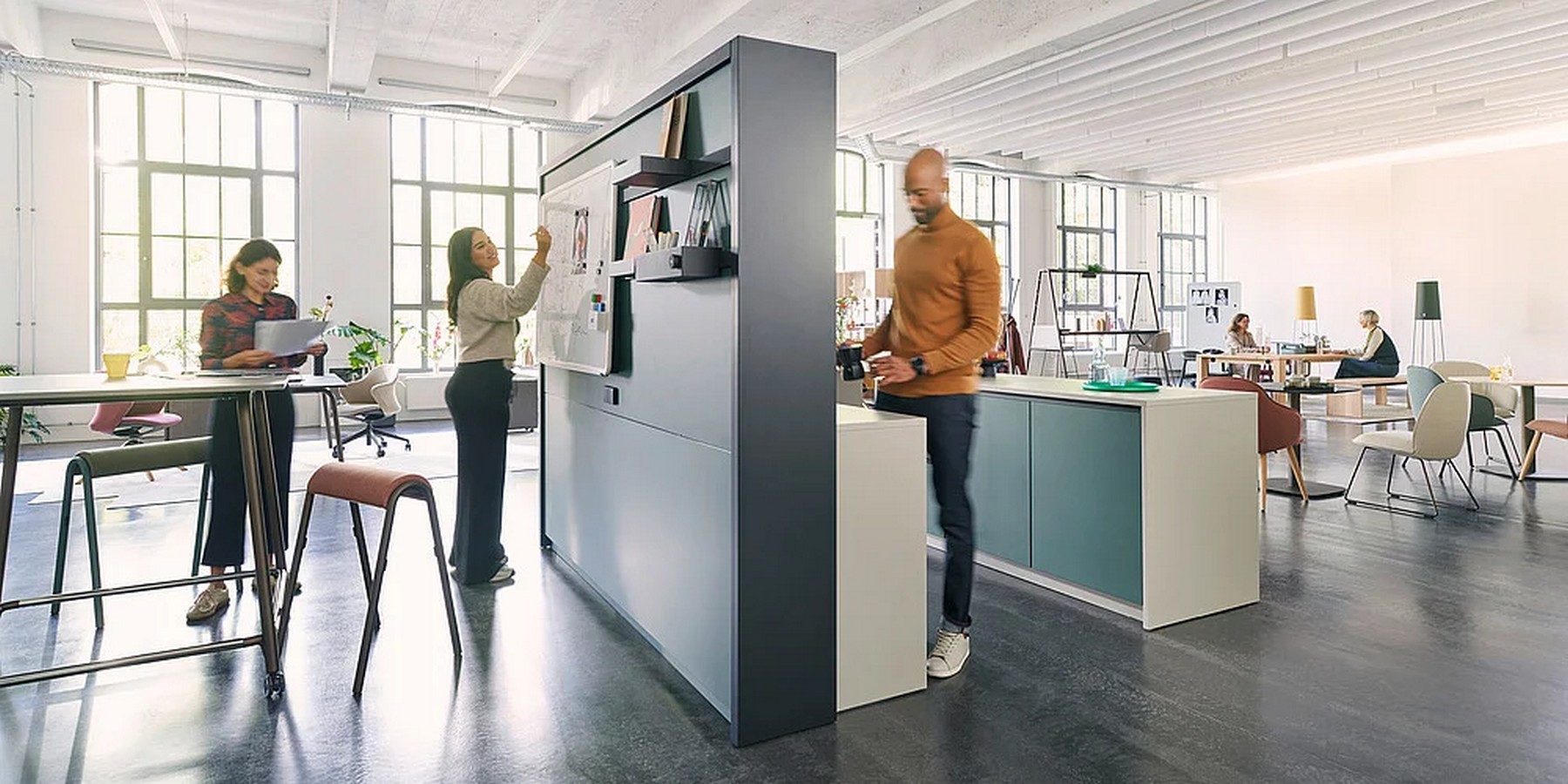 Als Anlaufstelle für spontane Treffen und Austausch im Büro schaffen die Cateringmodule eine informelle und ungezwungene Atmosphäre. Die Kommunikation ergibt sich hier von selbst und dank der vielfältigen Stellvarianten passen sie in jede Räumlichkeit.