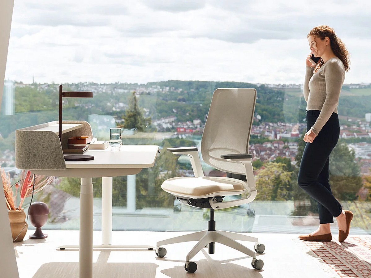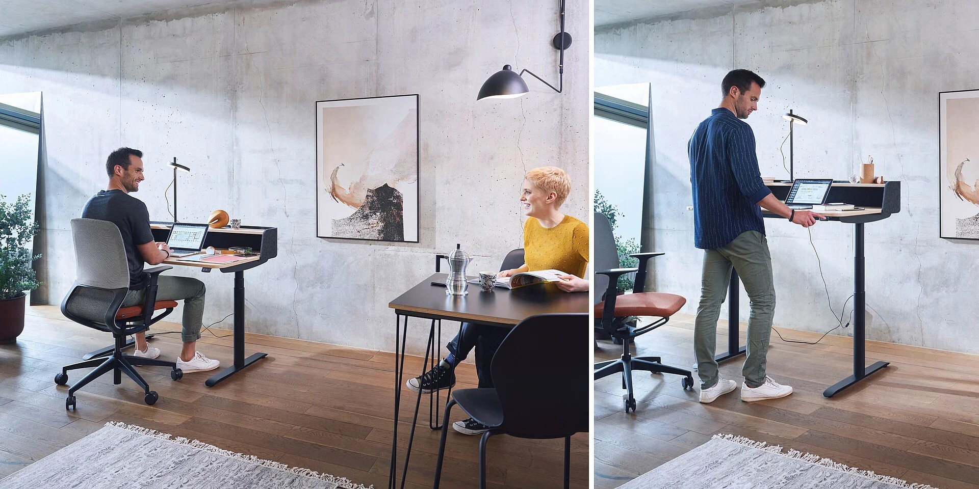 Der elektrisch höhenverstellbare Tisch folgt der Arbeitshöhe des Nutzers und bietet somit besten ergonomischen Komfort – egal, ob sitzend oder stehend.